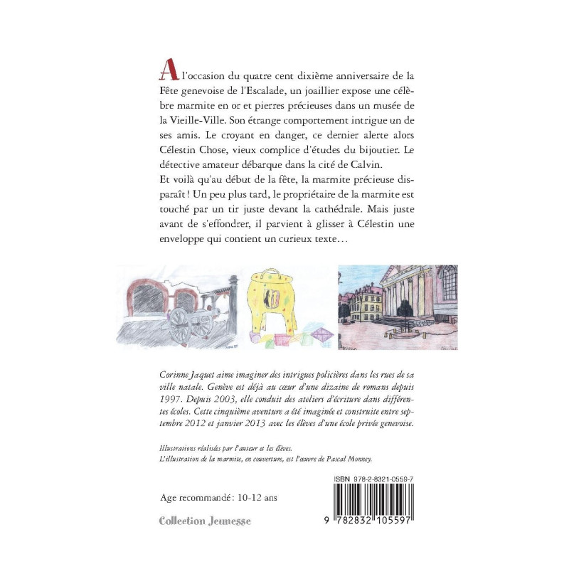 Corinne Jaquet aime imaginer des intrigues policières dans les rues de sa ville natale. Genève est déjà au cœur d’une dizaine de romans depuis 1997. Depuis 2003, elle conduit des ateliers d’écriture dans différentes écoles. Cette cinquième aventure a été imaginée et construite entre septembre 2012 et janvier 2013 avec les élèves d’une école privée genevoise.