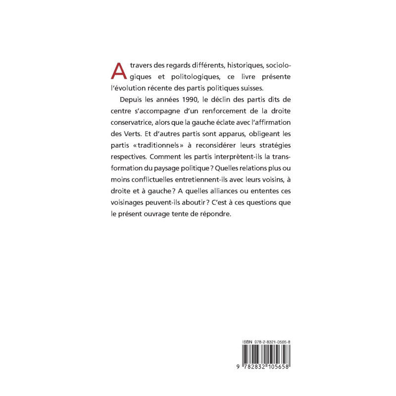 A travers des regards différents, historiques, sociologiques et politologiques, ce livre présente l’évolution récente des partis politiques suisses. Depuis les années 1990, le déclin des partis dits de centre s’accompagne d’un renforcement de la droite conservatrice, alors que la gauche éclate avec l’affirmation des Verts. Et d’autres partis sont apparus, obligeant les partis «traditionnels» à reconsidérer leurs stratégies respectives. Comment les partis interprètent-ils la transformation du paysage politique? Quelles relations plus ou moins conflictuelles entretiennent-ils avec leurs voisins, à droite et à gauche? A quelles alliances ou ententes ces voisinages peuvent-ils aboutir? C’est à ces questions que le présent ouvrage tente de répondre.