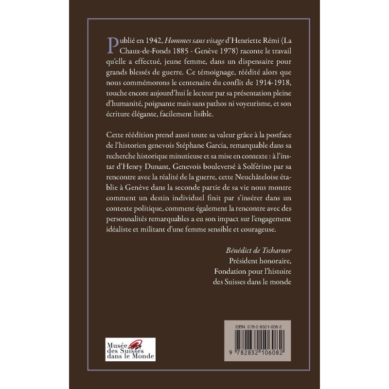 Publié en 1942, Hommes sans visage d’Henriette Rémi (La Chaux-de-Fonds 1885 - Genève 1978) raconte le travail qu’elle a effectué, jeune femme, dans un dispensaire pour grands blessés de guerre. Ce témoignage, réédité alors que nous commémorons le centenaire du conflit de 1914-1918, touche encore aujourd’hui le lecteur par sa présentation pleine d’humanité, poignante mais sans pathos ni voyeurisme, et son écriture élégante, facilement lisible.