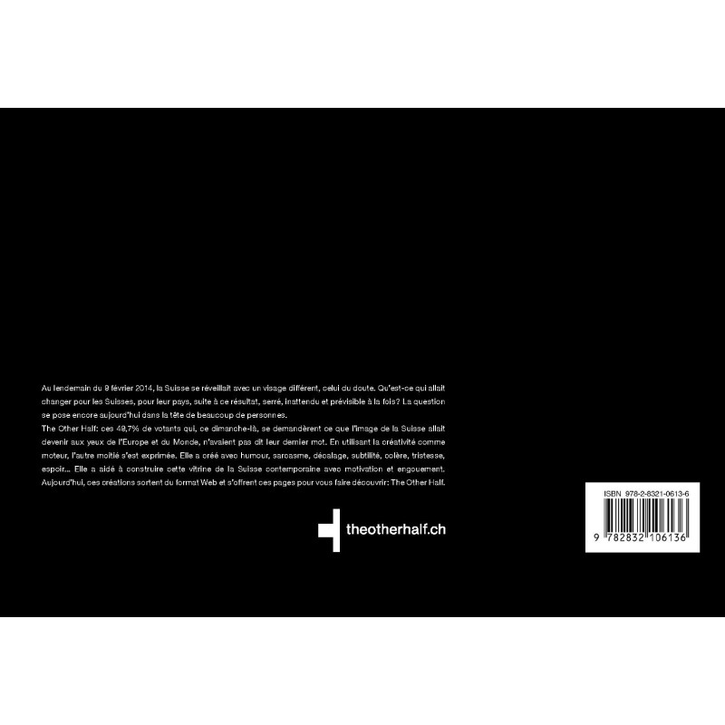 Au lendemain du 9 février 2014, la Suisse se réveillait avec un visage différent, celui du doute. Qu’est-ce qui allait changer pour les Suisses, pour leur pays, suite à ce résultat, serré, inattendu et prévisible à la fois? La question se pose encore aujourd’hui dans la tête de beaucoup de personnes. The Other Half: ces 49,7% de votants qui, ce dimanche-là, se demandèrent ce que l’image de la Suisse allait devenir aux yeux de l’Europe et du Monde, n’avaient pas dit leur dernier mot. En utilisant la créativité comme moteur, l’autre moitié s’est exprimée. Elle a créé avec humour, sarcasme, décalage, subtilité, colère, tristesse, espoir... Elle a aidé à construire cette vitrine de la Suisse contemporaine avec motivation et engouement. Aujourd’hui, ces créations sortent du format Web et s’offrent ces pages pour vous faire découvrir: The Other Half.