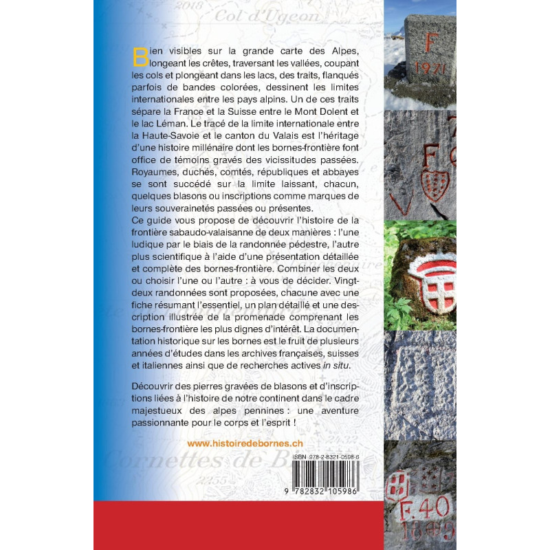 Bien visibles sur la grande carte des Alpes, longeant les crêtes, traversant les vallées, coupant les cols et plongeant dans les lacs, des traits, flanqués parfois de bandes colorées, dessinent l les limites internationales entre les pays alpins. Un de ces traits sépare la France et la Suisse entre le Mont Dolent et le lac Léman. Le tracé de la limite internationale entre la Haute-Savoie et le canton du Valais est l’héritage d’une histoire millénaire dont les bornes-frontière font office de témoins gravés des vicissitudes passées. Royaumes, duchés, comtés, républiques et abbayes se sont succédé sur la limite laissant, chacun, quelques blasons ou inscriptions comme marques de leurs souverainetés passées ou présentes. Ce guide vous propose de découvrir l’histoire de la frontière sabaudo-valaisanne de deux manières : l’une ludique par le biais de la randonnée pédestre, l’autre plus scientifique à l’aide d’une présentation détaillée et complète des bornes-frontière. Combiner les deux ou choisir l’une ou l’autre : à vous de décider. Vingt-deux randonnées sont proposées, chacune avec une fiche résumant l’essentiel, un plan détaillé et une description illustrée de la promenade comprenant les bornes-frontière les plus dignes d’intérêt. La documentation historique sur les bornes est le fruit de plusieurs années d’études dans les archives françaises, suisses et italiennes ainsi que de recherches actives in situ. Découvrir des pierres gravées de blasons et d’inscriptions liées à l’histoire de notre continent dans le cadre majestueux des alpes pennines : une aventure passionnante pour le corps et l’esprit !