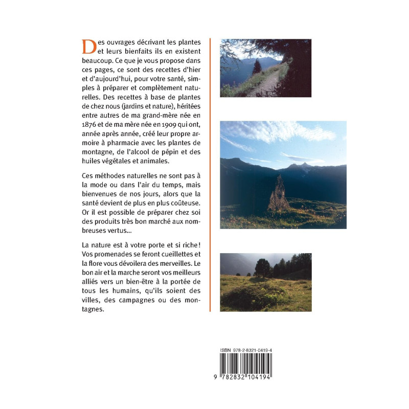 Des ouvrages décrivant les plantes et leurs bienfaits, il en existe beaucoup. Ce que je vous propose dans ces pages, ce sont des recettes d’hier et d’aujourd’hui, pour votre santé, simples à préparer et complètement naturelles. Des recettes à base de plantes de chez nous (jardins et nature), héritées entre autres de ma grand-mère née en 1876 et de ma mère née en 1909 qui ont, année après année, créé leur propre armoire à pharmacie avec les plantes de montagne, de l’alcool de fruits à pépins et des huiles végétales et animales.