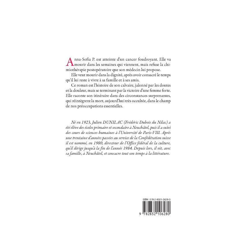 Anna-Sofia P. est atteinte d’un cancer foudroyant. Elle va mourir dans les semaines qui viennent, mais refuse la chimiothérapie postopératoire que son médecin lui propose. Elle veut mourir dans la dignité, après avoir consacré le temps qu’il lui reste à vivre à sa famille et à ses amis. Ce roman est l’histoire de son calvaire, jalonné par les doutes et la douleur, mais se terminant par la victoire d’une femme forte. Elle raconte son itinéraire dans des circonstances surprenantes, qui réintègrent la mort, aujourd’hui très occultée, dans le champ de nos préoccupations essentielles.