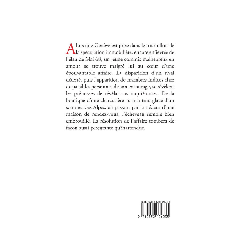 Alors que Genève est prise dans le tourbillon de la spéculation immobilière, encore enfiévrée de l’élan de Mai 68, un jeune commis malheureux en amour se trouve malgré lui au cœur d’une épouvantable affaire. La disparition d’un rival détesté, puis l’apparition de macabres indices chez de paisibles personnes de son entourage, se révèlent les prémisses de révélations inquiétantes. De la boutique d’une charcutière au manteau glacé d’un sommet des Alpes, en passant par la tiédeur d’une maison de rendez-vous, l’écheveau semble bien embrouillé. La résolution de l’affaire tombera de façon aussi percutante qu’inattendue.
