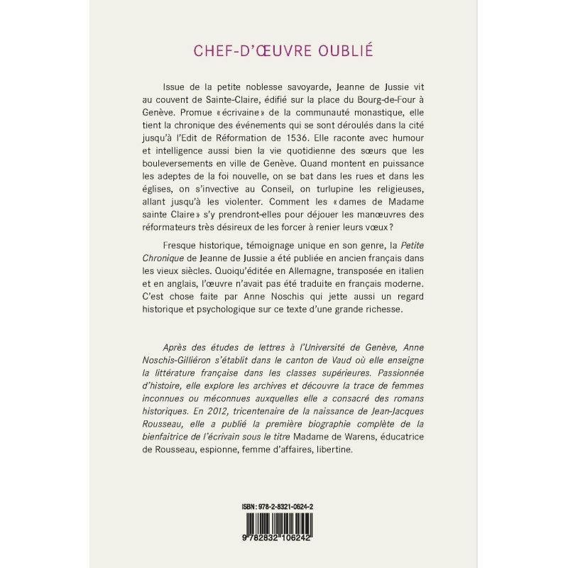 Fresque historique, témoignage unique en son genre, la Petite Chronique de Jeanne de Jussie a été publiée en ancien français dans les vieux siècles. Quoiqu’éditée en Allemagne, transposée en italien et en anglais, l’œuvre n’avait pas été traduite en français moderne. C’est chose faite par Anne Noschis qui jette aussi un regard historique et psychologique sur ce texte d’une grande richesse.