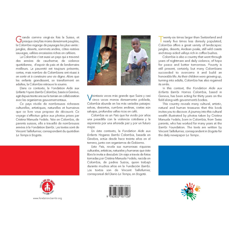 Twenty-six times larger than Switzerland and nearly five times less densely populated, Colombia offers a great variety of landscapes: jungles, deserts, Andean peaks, still wild coasts and steep-sided valleys rich in coffee bushes. Colombia is also a country that went through years of nightmare and daily violence, of hope for peace and better tomorrows. Poverty is still present, certainly, but many Colombians succeeded to overcome it and build an honorable life. As their children were growing up, turning into adults, Colombia has also regained its smile. In this context, the Fondation Aide aux Enfants Bambi Homes Colombia, based in Geneva, has been acting for thirty years on the field along with government’s bodies. This country reveals many cultural, artistic, natural and human treasures that this book invites you to discover. A journey into this cultural wealth illustrated by photos taken by Cristina Manuela Fedele, born in Colombia, from Swiss parents, who has worked for many years at the Bambi Foundation. The texts are written by Vincent Taillefumier, correspondent in Bogota for the daily newspaper Le Temps .