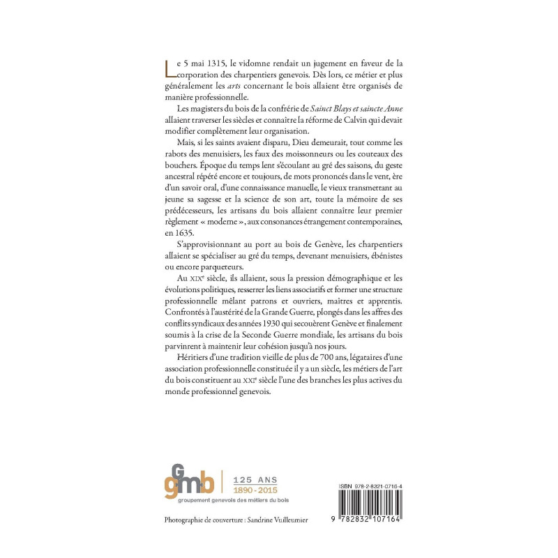 Au XIXe siècle, ils allaient, sous la pression démographique et les évolutions politiques, resserrer les liens associatifs et former une structure professionnelle mêlant patrons et ouvriers, maîtres et apprentis. Confrontés à l’austérité de la Grande Guerre, plongés dans les affres des conflits syndicaux des années 1930 qui secouèrent Genève et finalement soumis à la crise de la Seconde Guerre mondiale, les artisans du bois parvinrent à maintenir leur cohésion jusqu’à nos jours.
