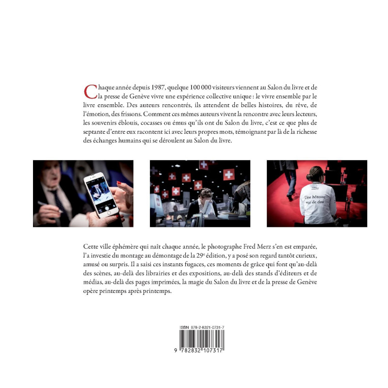 Cette ville éphémère qui naît chaque année, le photographe Fred Merz s’en est emparée, l’a investie du montage au démontage de la 29e édition, y a posé son regard tantôt curieux, amusé ou surpris. Il a saisi ces instants fugaces, ces moments de grâce qui font qu’au-delà des scènes, au-delà des librairies et des expositions, au-delà des stands d’éditeurs et de médias, au-delà des pages imprimées, la magie du Salon du livre et de la presse de Genève opère printemps après printemps.