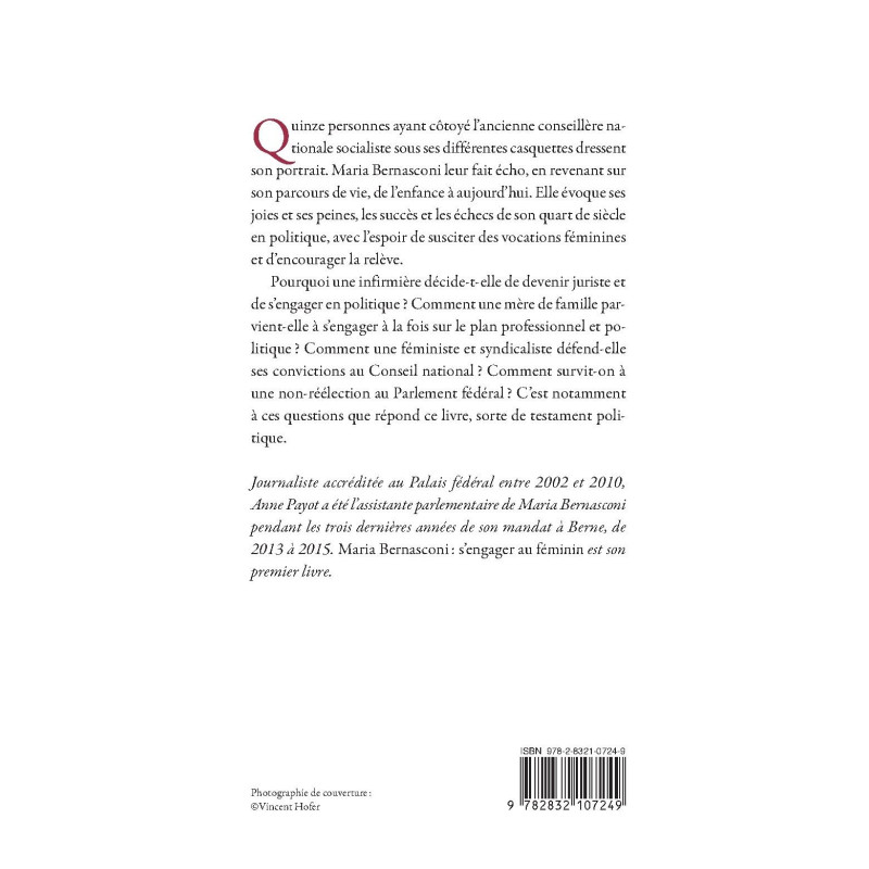 Quinze personnes ayant côtoyé l’ancienne conseillère nationale socialiste sous ses différentes casquettes dressent son portrait. Maria Bernasconi leur fait écho, en revenant sur son parcours de vie, de l’enfance à aujourd’hui. Elle évoque ses joies et ses peines, les succès et les échecs de son quart de siècle en politique, avec l’espoir de susciter des vocations féminines et d’encourager la relève. Pourquoi une infirmière décide-t-elle de devenir juriste et de s’engager en politique ? Comment une mère de famille parvient- elle à s’engager à la fois sur le plan professionnel et politique ? Comment une féministe et syndicaliste défend-elle ses convictions au Conseil national ? Comment survit-on à une non-réélection au Parlement fédéral ? C’est notamment à ces questions que répond ce livre, sorte de testament politique.