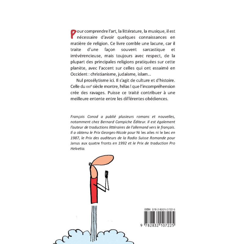 Pour comprendre l’art, la littérature, la musique, il est nécessaire d’avoir quelques connaissances en matière de religion. Ce livre comble une lacune, car il traite d’une façon souvent sarcastique et irrévérencieuse, mais toujours avec respect, de la plupart des principales religions pratiquées sur cette planète, avec l’accent sur celles qui ont essaimé en Occident : christianisme, judaïsme, islam…