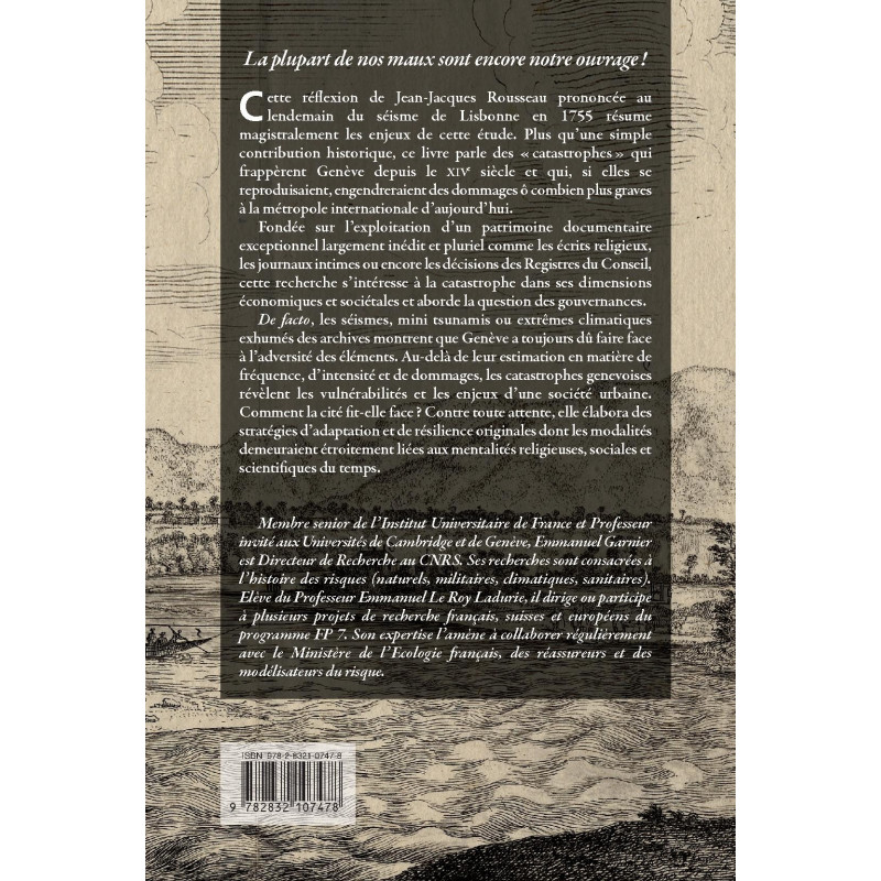 Cette réflexion de Jean-Jacques Rousseau prononcée au lendemain du séisme de Lisbonne en 1755 résume magistralement les enjeux de cette étude. Plus qu’une simple contribution historique, ce livre parle des « catastrophes» qui frappèrent Genève depuis le XIVe siècle et qui, si elles se reproduisaient, engendreraient des dommages ô combien plus graves à la métropole internationale d’aujourd’hui.
