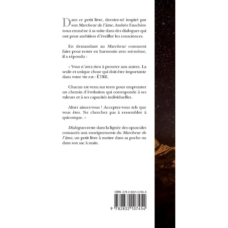 Dialogues reste dans la lignée des opuscules consacrés aux enseignements du Marcheur de l’âme, un petit livre à mettre dans sa poche ou dans son sac à main.