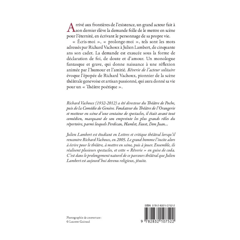 Julien Lambert est étudiant en Lettres et critique théâtral lorsqu’il rencontre Richard Vachoux, en 2005. Le grand homme l’incite alors à écrire pour le théâtre, à mettre en scène, puis à jouer. Ensemble, ils réalisent plusieurs spectacles, et cette « Rêverie » en guise de coda. C’est dans le prolongement naturel de ce parcours théâtral que Julien Lambert est aujourd’hui devenu religieux, jésuite.