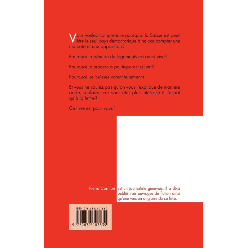 Vous voulez comprendre pourquoi la Suisse est peut-être le seul pays démocratique à ne pas compter une majorité et une opposition ? Pourquoi la pénurie de logements est aussi vive ? Pourquoi le processus politique est si lent ? Pourquoi les Suisses votent tellement ? Et vous ne voulez pas qu’on vous l’explique de manière aride, scolaire, car vous êtes plus intéressé à l’esprit qu’à la lettre ? Ce livre est pour vous !