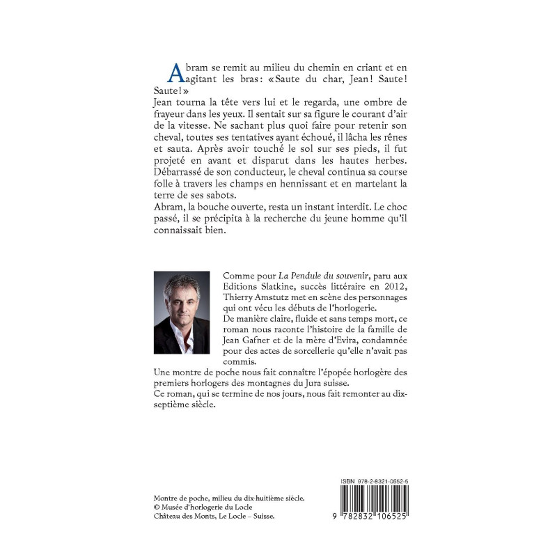 Comme pour La Pendule du souvenir, paru aux Editions Slatkine, succès littéraire en 2012, Thierry Amstutz met en scène des personnages qui ont vécu les débuts de l’horlogerie. De manière claire, fluide et sans temps mort, ce roman nous raconte l’histoire de la famille de Jean Gafner et de la mère d’Evira, condamnée pour des actes de sorcellerie qu’elle n’avait pas commis. Une montre de poche nous fait connaître l’épopée horlogère des premiers horlogers des montagnes du Jura suisse. Ce roman, qui se termine de nos jours, nous fait remonter au dix-septième siècle.