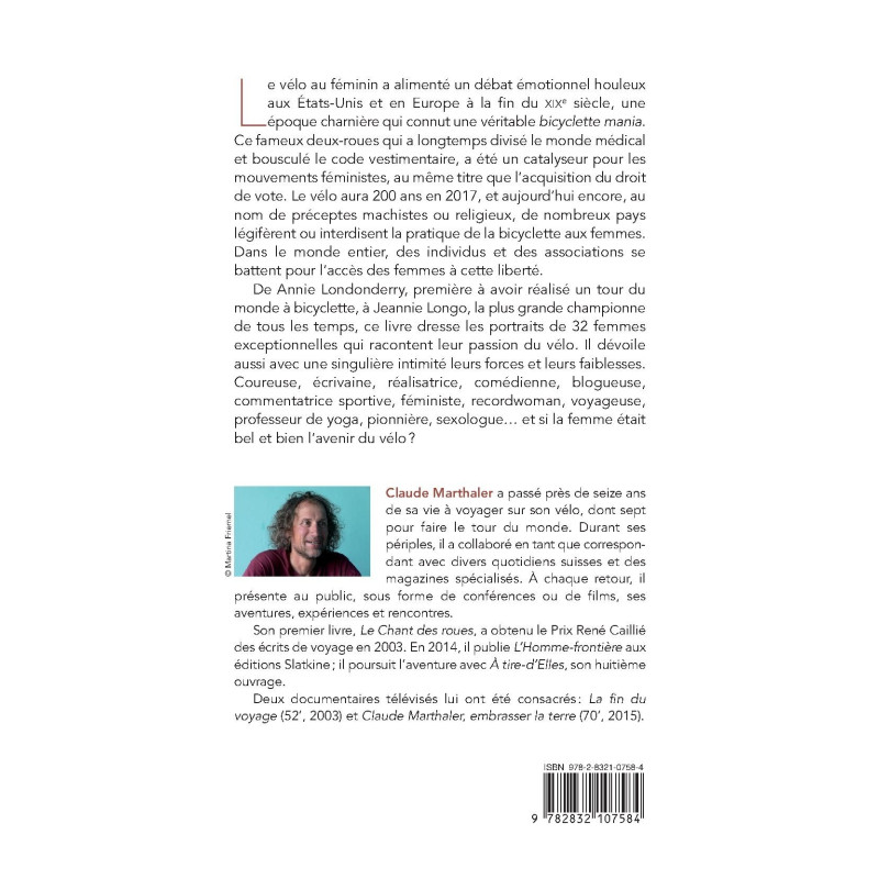 Claude Marthaler a passé près de seize ans de sa vie à voyager sur son vélo, dont sept pour faire le tour du monde. Durant ses périples, il a collaboré en tant que correspondant avec divers quotidiens suisses et des magazines spécialisés. À chaque retour, il présente au public, sous forme de conférences ou de films, ses aventures, expériences et rencontres. Son premier livre, Le Chant des roues, a obtenu le Prix René Caillié des écrits de voyage en 2003. En 2014, il publie L’Homme-frontière aux éditions Slatkine ; il poursuit l’aventure avec À tire-d’Elles, son huitième ouvrage. Deux documentaires télévisés lui ont été consacrés: La fin du voyage (52’, 2003) et Claude Marthaler, embrasser la terre (70’, 2015).