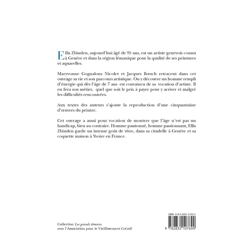Ellis Zbinden, aujourd’hui âgé de 95 ans, est un artiste genevois connu à Genève et dans la région lémanique pour la qualité de ses peintures et aquarelles. Maryvonne Gognalons Nicolet et Jacques Boesch retracent dans cet ouvrage sa vie et son parcours artistique. On y découvre un homme rempli d’énergie qui dès l’âge de 7 ans est convaincu de sa vocation d’artiste. Il en fera son métier, quel que soit le prix à payer pour y arriver et malgré les difficultés rencontrées. Aux textes des auteurs s’ajoute la reproduction d’une cinquantaine d’œuvres du peintre.