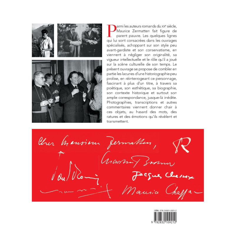 Parmi les auteurs romands du XXe siècle, Maurice Zermatten fait figure de parent pauvre. Les quelques lignes qui lui sont consacrées dans les ouvrages spécialisés, achoppant sur son style peu avant-gardiste et son conservatisme, en viennent à négliger son originalité, sa vigueur intellectuelle et le rôle qu’il a joué sur la scène culturelle de son temps. Le présent ouvrage se propose de combler en partie les lacunes d’une historiographie peu prolixe, en réinterrogeant ce personnage, fascinant à plus d’un titre, à travers sa poétique, son esthétique, sa biographie, son contexte historique et surtout son ample correspondance, jusque-là inédite. Photographies, transcriptions et autres commentaires viennent donner chair à ces objets, au hasard des mots, des ratures et des émotions qu’ils révèlent et transmettent.