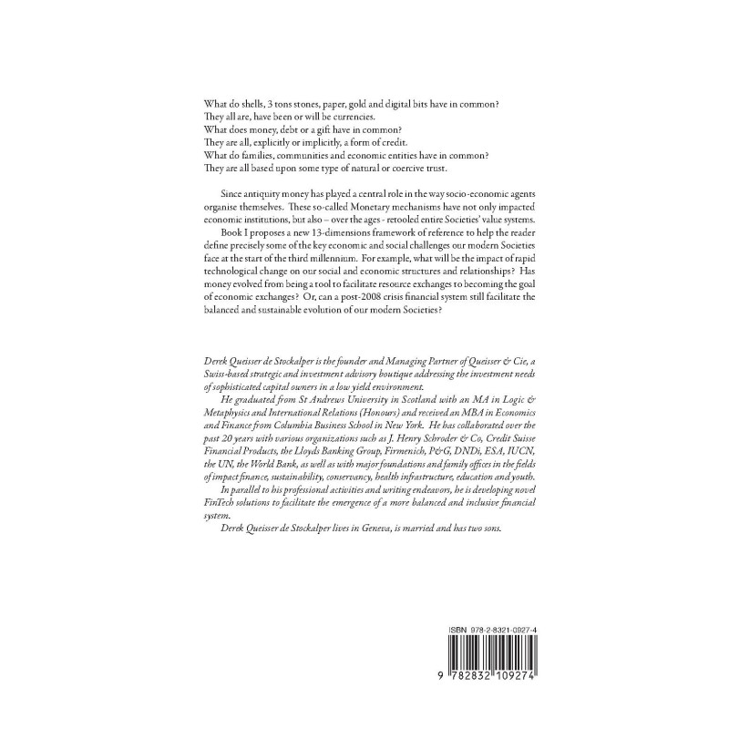 Since antiquity money has played a central role in the way socio-economic agents organise themselves. These so-called Monetary mechanisms have not only impacted economic institutions, but also – over the ages - retooled entire Societies’ alue systems. Book I proposes a new 13-dimensions framework of reference to help the reader define precisely some of the key economic and social challenges our modern Societies face at the start of the third millennium. For example, what will be the impact of rapid technological change on our social and economic structures and relationships? Has money evolved from being a tool to facilitate resource exchanges to ecoming the goal of economic exchanges? Or, can a post-2008 crisis financial system still facilitate the balanced and sustainable evolution of our modern Societies?