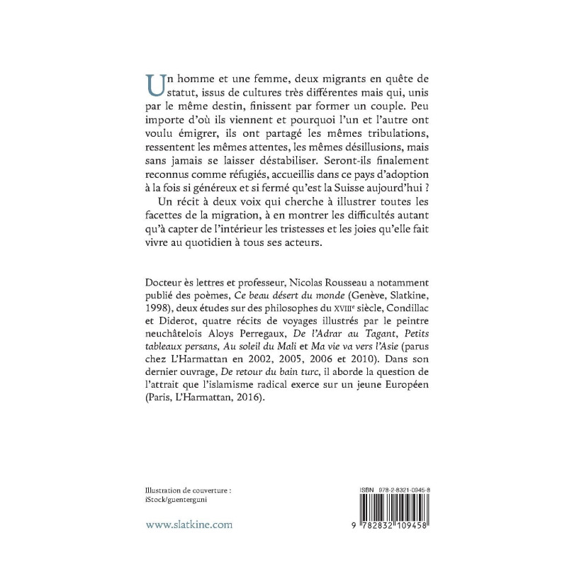 Un homme et une femme, deux migrants en quête de statut, issus de cultures très différentes mais qui, unis par le même destin, finissent par former un couple. Peu importe d’où ils viennent et pourquoi l’un et l’autre ont voulu émigrer, ils ont partagé les mêmes tribulations, ressentent les mêmes attentes, les mêmes désillusions, mais sans jamais se laisser déstabiliser. Seront-ils finalement reconnus comme réfugiés, accueillis dans ce pays d’adoption à la fois si généreux et si fermé qu’est la Suisse aujourd’hui ?
