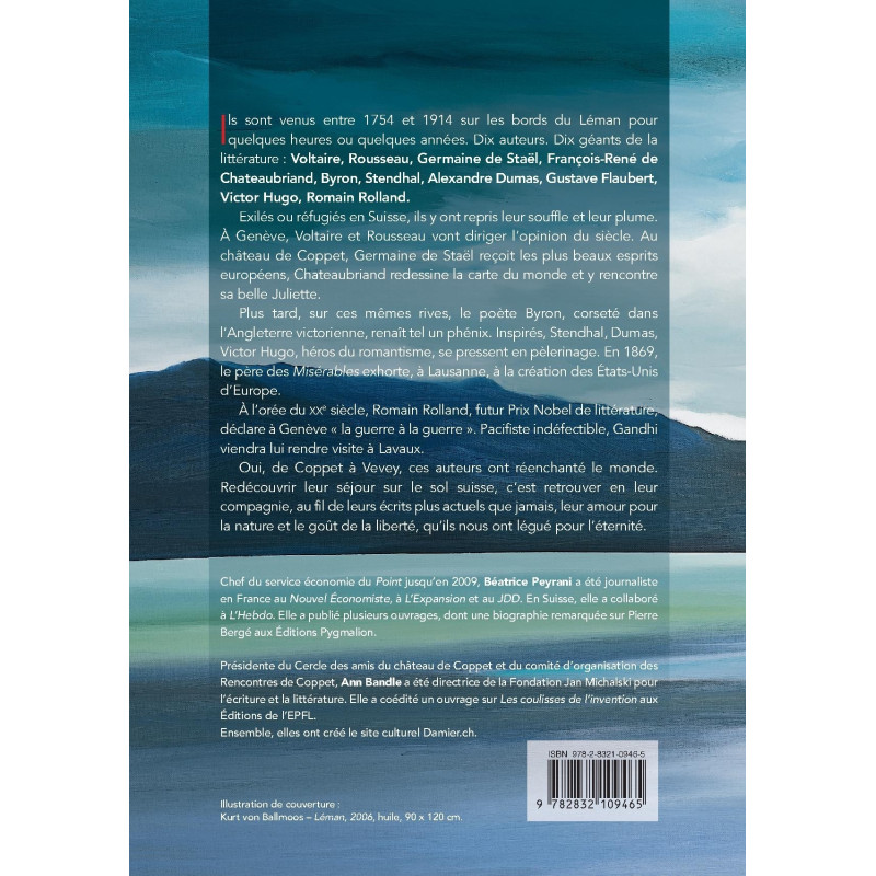 Ils sont venus entre 1754 et 1914 sur les bords du Léman pour quelques heures ou quelques années. Dix auteurs. Dix géants de la littérature : Voltaire, Rousseau, Germaine de Staël, François-René de Chateaubriand, Byron, Stendhal, Alexandre Dumas, Gustave Flaubert, Victor Hugo, Romain Rolland.