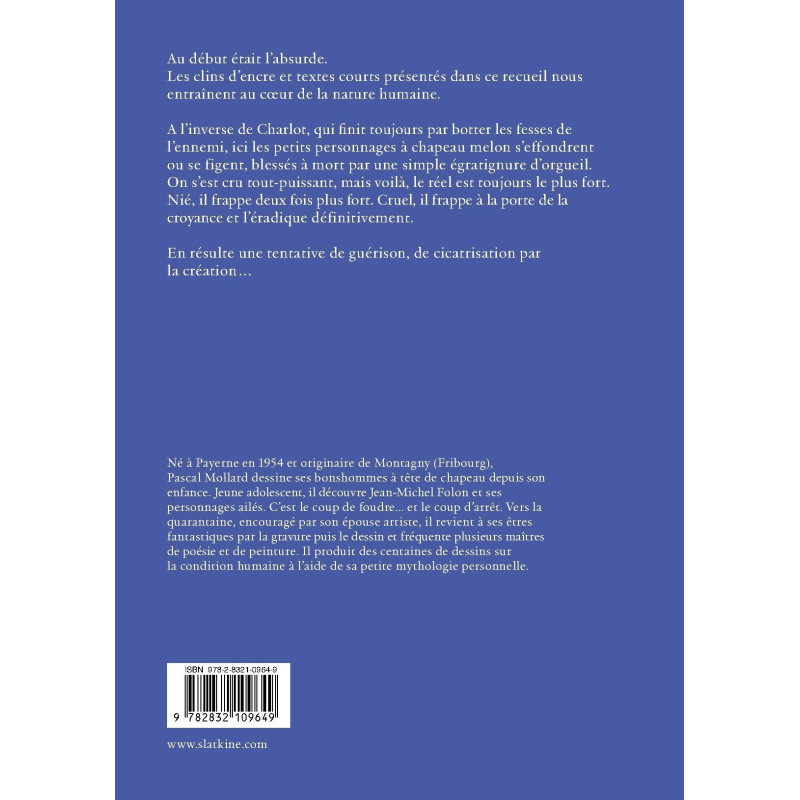 Né à Payerne en 1954 et originaire de Montagny (Fribourg), Pascal Mollard dessine ses bonshommes à tête de chapeau depuis son enfance. Jeune adolescent, il découvre Jean-Michel Folon et ses personnages ailés. C’est le coup de foudre... et le coup d’arrêt. Vers la quarantaine, encouragé par son épouse artiste, il revient à ses êtres fantastiques par la gravure puis le dessin et fréquente plusieurs maîtres de poésie et de peinture. Il produit des centaines de dessins sur la condition humaine à l’aide de sa petite mythologie personnelle.