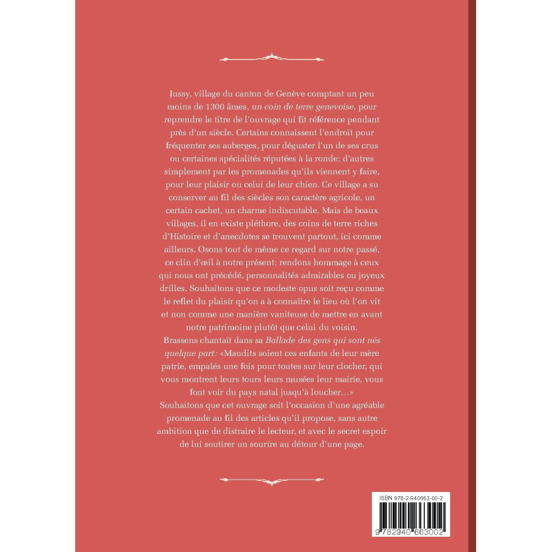 Jussy, village du canton de Genève comptant un peu moins de 1300 âmes, un coin de terre genevoise, pour reprendre le titre de l’ouvrage qui fit référence pendant près d’un siècle. Certains connaissent l’endroit pour fréquenter ses auberges, pour déguster l’un de ses crus ou certaines spécialités réputées à la ronde ; d’autres simplement par les promenades qu’ils viennent y faire,pour leur plaisir ou celui de leur chien. Ce village a su conserver au fil des siècles son caractère agricole, un certain cachet, un charme indiscutable. Mais de beaux villages, il en existe pléthore, des coins de terre riches d’Histoire et d’anecdotes se trouvent partout, ici comme ailleurs. Osons tout de même ce regard sur notre passé, ce clin d’oeil à notre présent ; rendons hommage à ceux qui nous ont précédé, personnalités admirables ou joyeux drilles. Souhaitons que ce modeste opus soit reçu comme le reflet du plaisir qu’on a à connaître le lieu où l’on vit et non comme une manière vaniteuse de mettre en avant notre patrimoine plutôt que celui du voisin.