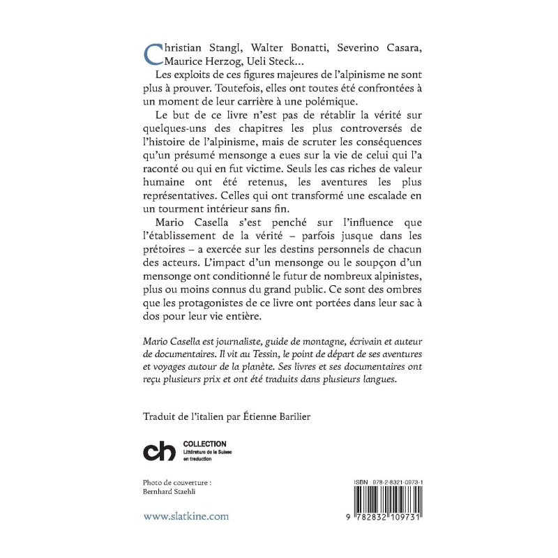 Mario Casella s’est penché sur l’influence que l’établissement de la vérité – parfois jusque dans les prétoires – a exercée sur les destins personnels de chacun des acteurs. L’impact d’un mensonge ou le soupçon d’un mensonge ont conditionné le futur de nombreux alpinistes, plus ou moins connus du grand public. Ce sont des ombres que les protagonistes de ce livre ont portées dans leur sac à dos pour leur vie entière.