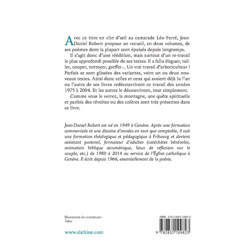 Avec ce titre en clin d’oeil au camarade Léo Ferré, Jean-Daniel Robert propose un recueil, en deux volumes, de ses poèmes dont la plupart sont épuisés depuis longtemps.