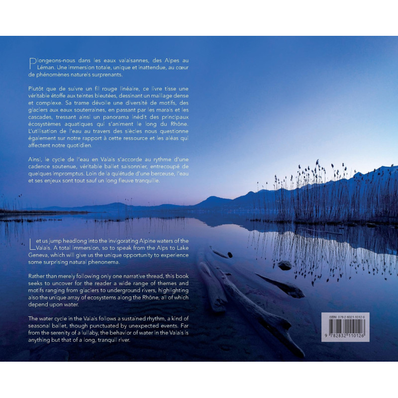 Plutôt que de suivre un fil rouge linéaire, ce livre tisse une véritable étoffe aux teintes bleutées, dessinant un maillage dense et complexe. Sa trame dévoile une diversité de motifs, des glaciers aux eaux souterraines, en passant par les marais et les cascades, tressant ainsi un panorama inédit des principaux écosystèmes aquatiques qui s’animent le long du Rhône. L’utilisation de l’eau au travers des siècles nous questionne également sur notre rapport à cette ressource et les aléas qui affectent notre quotidien.