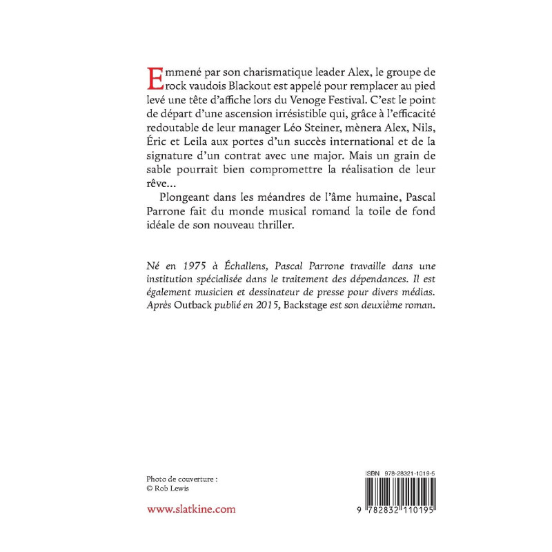 Né en 1975 à Échallens, Pascal Parrone travaille dans une institution spécialisée dans le traitement des dépendances. Il est également musicien et dessinateur de presse pour divers médias. Après Outback publié en 2015, Backstage est son deuxième roman.