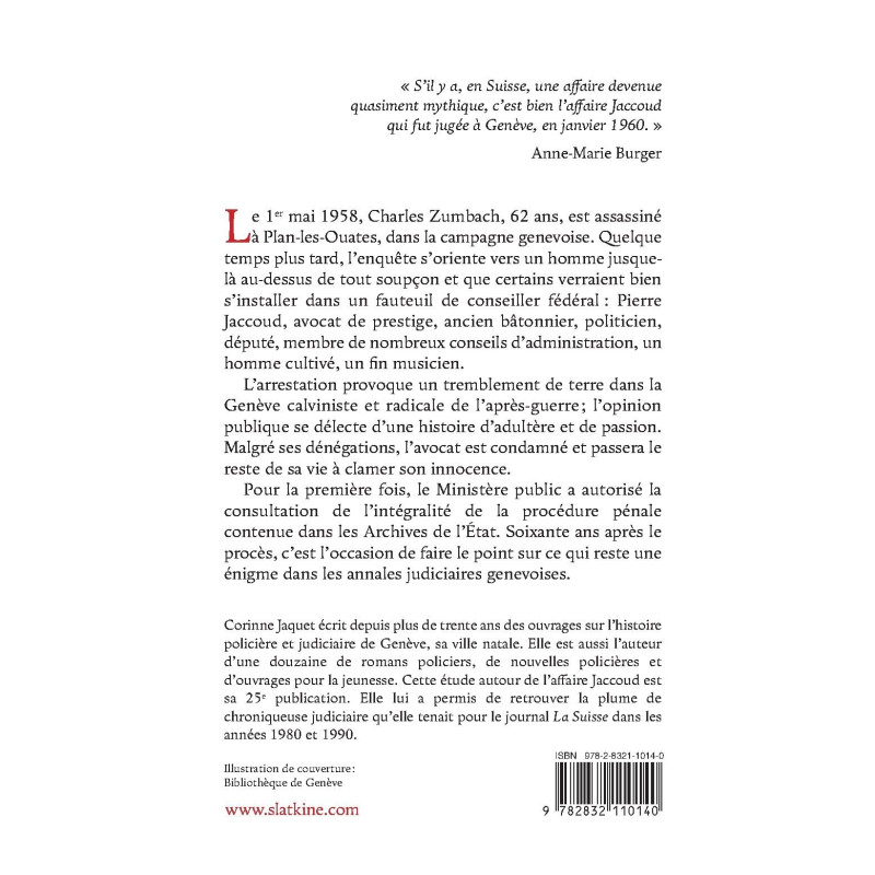 « S’il y a, en Suisse, une affaire devenue quasiment mythique, c’est bien l’affaire Jaccoud qui fut jugée à Genève, en janvier 1960. » Anne-Marie Burger