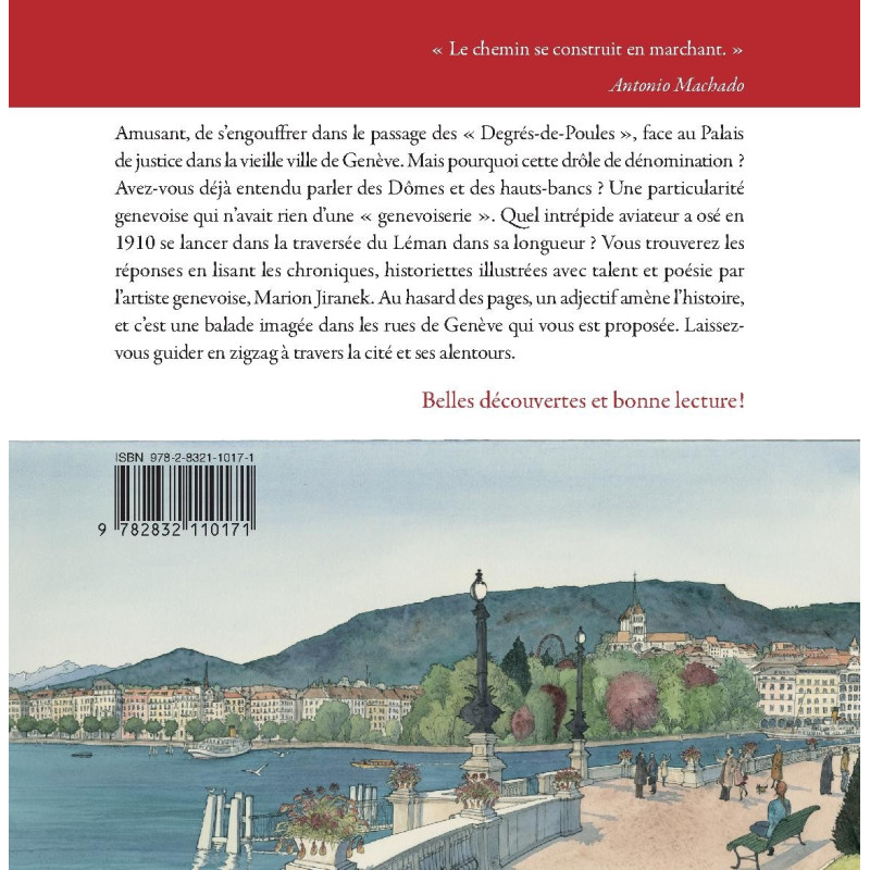 Amusant, de s’engouffrer dans le passage des «Degrés-de-Poules », face au Palais de justice dans la vieille ville de Genève. Mais pourquoi cette drôle de dénomination ? Avez-vous déjà entendu parler des Dômes et des hauts-bancs ? Une particularité genevoise qui n’avait rien d’une « genevoiserie ». Quel intrépide aviateur a osé en 1910 se lancer dans la traversée du Léman dans sa longueur ? Vous trouverez les réponses en lisant les chroniques, historiettes illustrées avec talent et poésie par l’artiste genevoise, Marion Jiranek. Au hasard des pages, un adjectif amène l’histoire, et c’est une balade imagée dans les rues de Genève qui vous est proposée. Laissez-vous guider en zigzag à travers la cité et ses alentours.