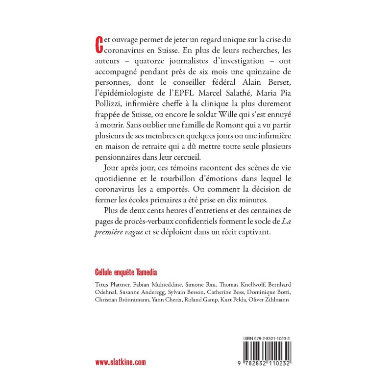 Cet ouvrage permet de jeter un regard unique sur la crise du coronavirus en Suisse. En plus de leurs recherches, les auteurs – quatorze journalistes d’investigation – ont accompagné pendant près de six mois une quinzaine de personnes, dont le conseiller fédéral Alain Berset, l’épidémiologiste de l’EPFL Marcel Salathé, Maria Pia Pollizzi, infirmière cheffe à la clinique la plus durement