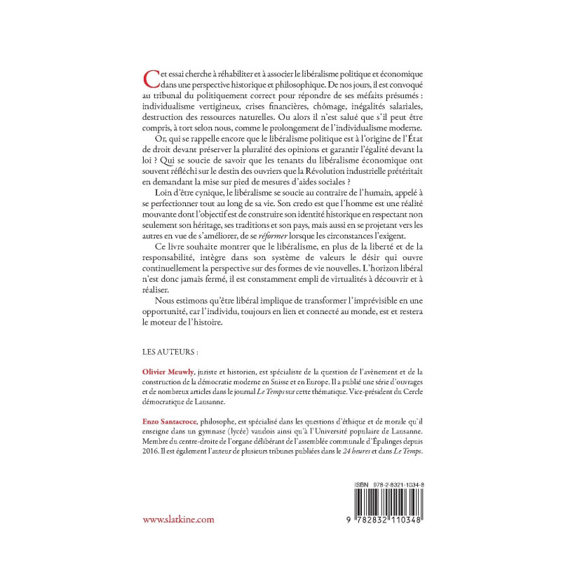 Cet essai cherche à réhabiliter et à associer le libéralisme politique et économique dans une perspective historique et philosophique. De nos jours, il est convoqué au tribunal du politiquement correct pour répondre de ses méfaits présumés : individualisme vertigineux, crises financières, chômage, inégalités salariales, destruction des ressources naturelles. Ou alors il n’est salué que s’il peut être compris, à tort selon nous, comme le prolongement de l’individualisme moderne.