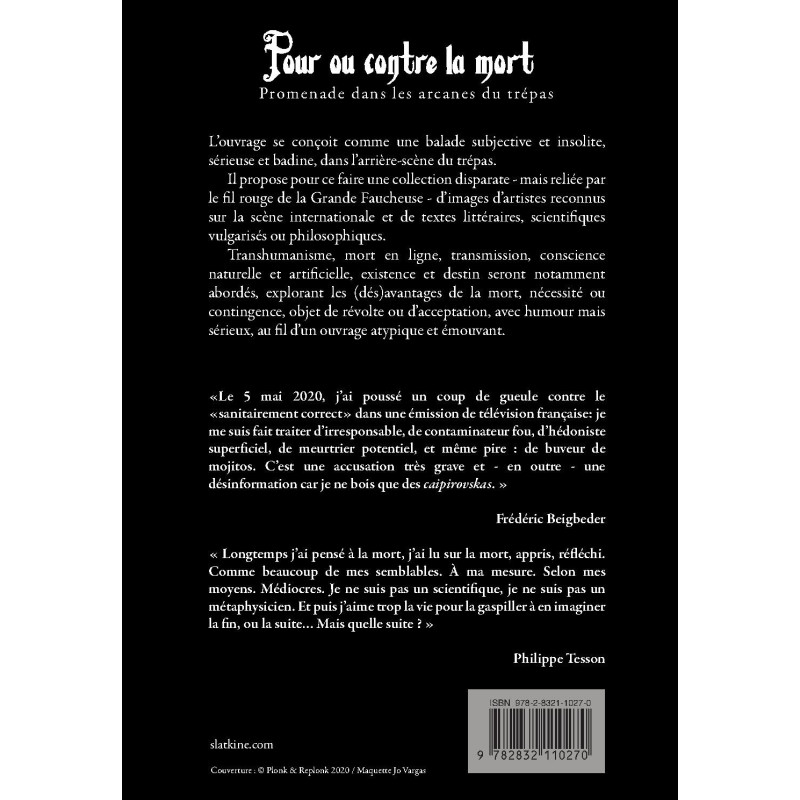L’ouvrage se conçoit comme une balade subjective et insolite, sérieuse et badine, dans l’arrière-scène du trépas.