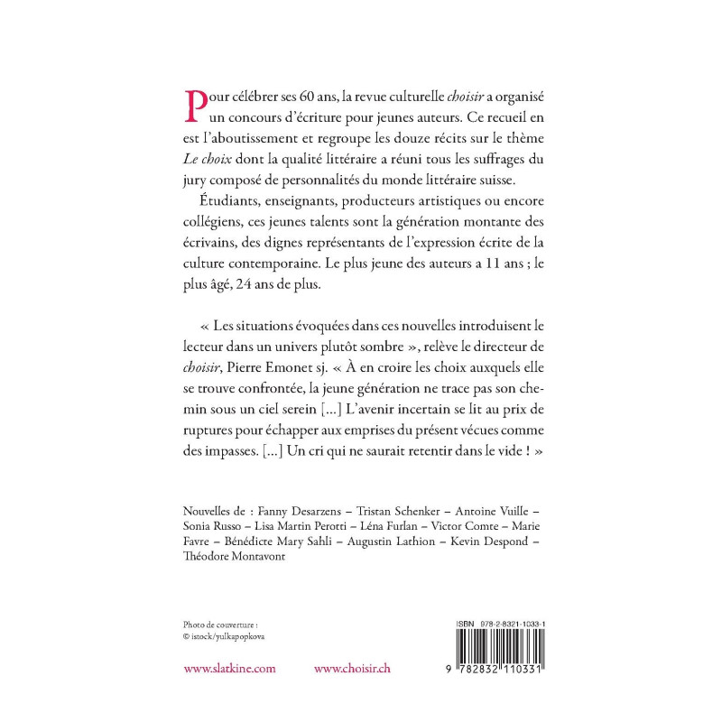 un concours d’écriture pour jeunes auteurs. Ce recueil en est l’aboutissement et regroupe les douze récits sur le thème Le choix dont la qualité littéraire a réuni tous les suffrages du jury composé de personnalités du monde littéraire suisse.