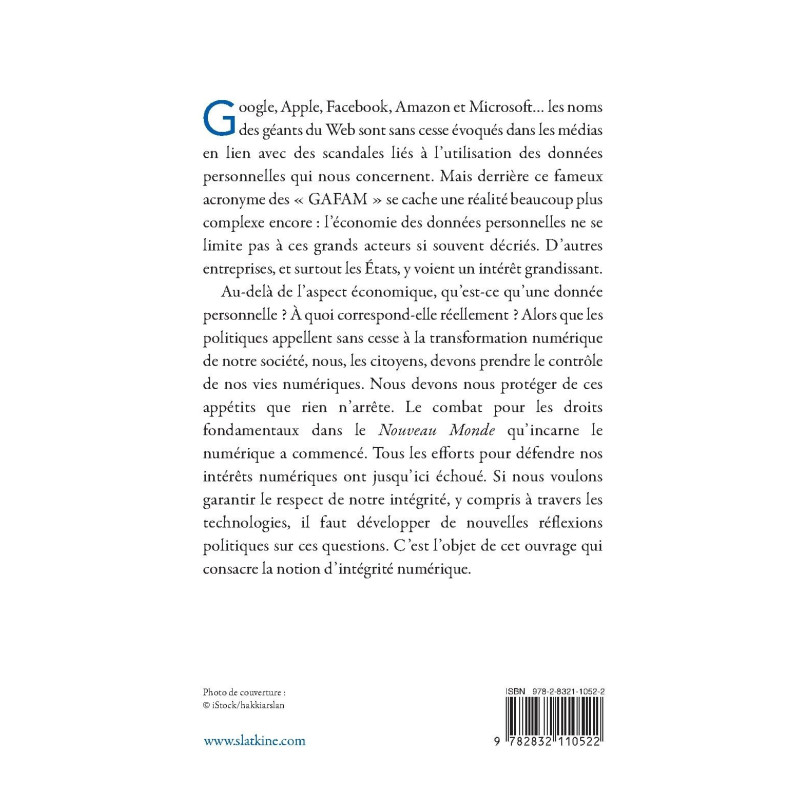 Au-delà de l’aspect économique, qu’est-ce qu’une donnée personnelle ? À quoi correspond-elle réellement ? Alors que les politiques appellent sans cesse à la transformation numérique de notre société, nous, les citoyens, devons prendre le contrôle de nos vies numériques. Nous devons nous protéger de ces appétits que rien n’arrête. Le combat pour les droits fondamentaux dans le Nouveau Monde qu’incarne le numérique a commencé. Tous les efforts pour défendre nos intérêts numériques ont jusqu’ici échoué. Si nous voulons garantir le respect de notre intégrité, y compris à travers les technologies, il faut développer de nouvelles réflexions politiques sur ces questions. C’est l’objet de cet ouvrage qui consacre la notion d’intégrité numérique.