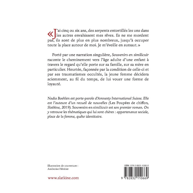 Nadia Boehlen est porte-parole d’Amnesty International Suisse. Elle est l’auteure d’un recueil de nouvelles (Les Poupées de chiffon, Slatkine, 2019). Souvenirs en similicuir est son premier roman. On y retrouve les thématiques qui lui sont chères : appartenance sociale, place de la femme, quête identitaire.