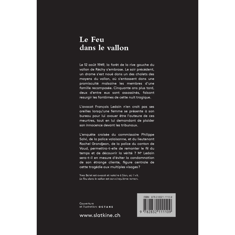 Yves Balet est avocat et notaire à Sion, où il vit. Le Feu dans le vallon est son cinquième roman.