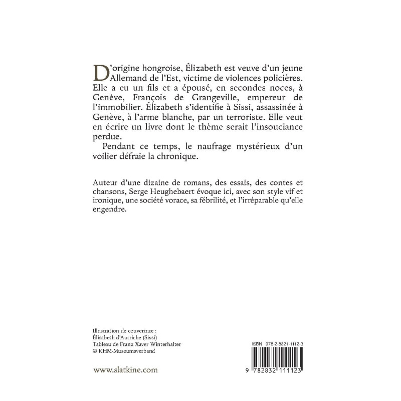 l’immobilier. Élizabeth s’identifie à Sissi, assassinée à Genève, à l’arme blanche, par un terroriste. Elle veut en écrire un livre dont le thème serait l’insouciance perdue.
