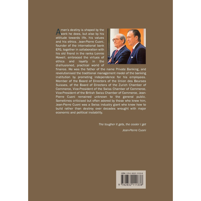 A man’s destiny is shaped by the work he does, but also by his attitude towards life, his values and his ethics. Jean-Pierre Cuoni, founder of the international bank EFG, together in collaboration with his old friend in the ranks Lonnie Howell, embraced the virtues of ethics and loyalty in the disillusioned, practical world of finance. He was the father of the name Private Banking, and revolutionised the traditional management model of the banking institution by promoting independence for his employees. Member of the Board of Directors of the Union des Bourses Suisses, of the Board of Directors of the Zurich Chamber of Commerce, Vice-President of the Swiss Chamber of Commerce, Vice-President of the British Swiss Chamber of Commerce, Jean-Pierre Cuoni remained unknown to the general public. Sometimes criticised but often adored by those who knew him, Jean-Pierre Cuoni was a Swiss industry giant who knew how to build rather than destroy over decades wrought with major economic and political instability.