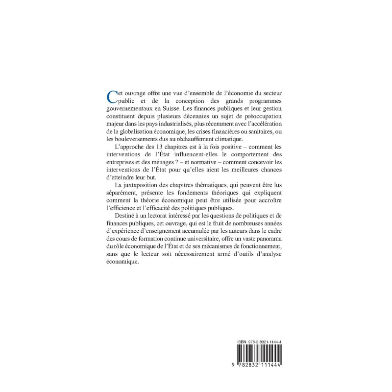 Cet ouvrage offre une vue d’ensemble de l’économie du secteur public et de la conception des grands programmes gouvernementaux en Suisse. Les finances publiques et leur gestion constituent depuis plusieurs décennies un sujet de préoccupation majeur dans les pays industrialisés, plus récemment avec l’accélération de la globalisation économique, les crises financières ou sanitaires, ou les bouleversements dus au réchauffement climatique.