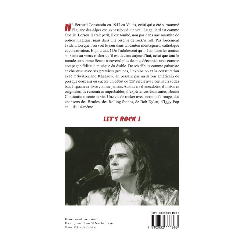 Né Bernard Constantin en 1947 en Valais, celui qui a été surnommé l’Iguane des Alpes est un passionné, un vrai. Le gaillard est comme Obélix. Lorsqu’il était petit, il est tombé, non pas dans une marmite de potion magique, mais dans une piscine de rock’n’roll. Pas forcément évident lorsque l’on voit le jour dans un canton montagnard, catholique et conservateur. Et pourtant ! De l’adolescent qu’il était dans les années soixante au vieux rocker qu’il est devenu aujourd’hui, celui que tout le monde surnomme Bernie a traversé plus de cinq décennies avec comme compagne fidèle la musique du diable. De ses débuts comme guitariste et chanteur avec ses premiers groupes, l’explosion et la consécration avec «Switzerland Reggae », en passant par un séjour américain de presque deux ans ou encore un début de XXIe siècle avec des hauts et des bas, l’Iguane se livre comme jamais. Au travers d’anecdotes, d’histoires originales, de rencontres improbables, d’expériences étonnantes, Bernie Constantin raconte sa vie. Une vie de rocker avec, comme fil rouge, des chansons des Beatles, des Rolling Stones, de Bob Dylan, d’Iggy Pop et… de lui-même.