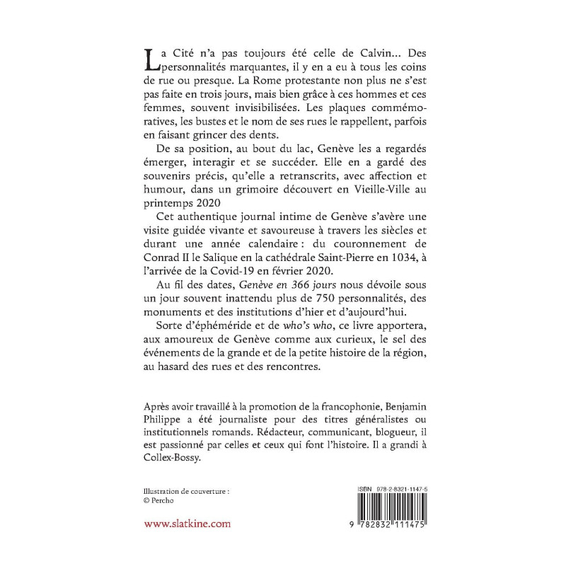 Cet authentique journal intime de Genève s’avère une visite guidée vivante et savoureuse à travers les siècles et durant une année calendaire : du couronnement de Conrad II le Salique en la cathédrale Saint-Pierre en 1034, à l’arrivée de la Covid-19 en février 2020.
