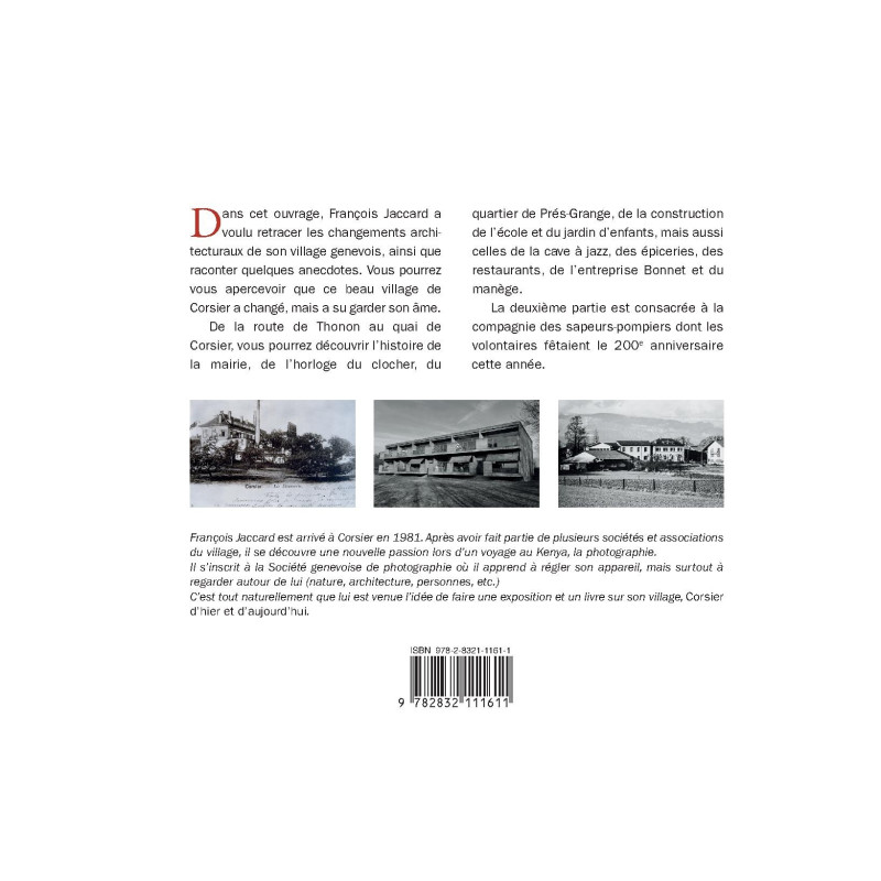 Dans cet ouvrage, François Jaccard a voulu retracer les changements architecturaux de son village genevois, ainsi que raconter quelques anecdotes. Vous pourrez vous apercevoir que ce beau village de Corsier a changé, mais a su garder son âme. De la route de Thonon au quai de Corsier, vous pourrez découvrir l’histoire de la mairie, de l’horloge du clocher, du quartier de Prés- Grange, de la construction de l’école et du jardin d’enfants, mais aussi celles de la cave à jazz, des épiceries, des restaurants, de l’entreprise Bonnet et du manège. La deuxième partie est consacrée à la compagnie des sapeurs-pompiers dont les volontaires fêtaient le 200e anniversaire cette année.