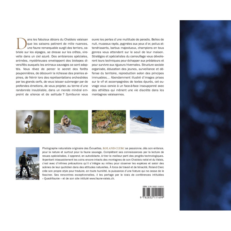 Dans les fabuleux décors du Chablais valaisan que les saisons patinent de mille nuances, une faune remarquable surgit des terriers, cabriole sur les alpages, se dresse sur les crêtes, virevolte dans un ciel azuré. Des ambiances spéciales, animées, mystérieuses enveloppent des biotopes diversifiés auxquels les animaux sauvages se sont adaptés. Vous rêvez de percer le secret des forêts pouponnières, de découvrir la richesse des prairies alpines, de frémir lors des représentations orchestrées par les grands cerfs, de vous laisser submerger par de profondes émotions, de vous projeter, au terme d’une randonnée inoubliable, dans un monde minéral empreint de silence et de solitude ? Symfaunie vous ouvre les portes d’une multitude de paradis. Belles de nuit, museaux rayés, pygmées aux yeux d’or, poilus attendrissants, barbus majestueux, champions en tous genres vous attendent sur le seuil de leur maison. Stratèges et spécialistes du camouflage vous dévoileront leurs techniques pour échapper aux prédateurs et pour survivre aux rigueurs hivernales. Structure sociale organisée, éducation des jeunes, surveillance et défense du territoire, reproduction selon des principes immuables…