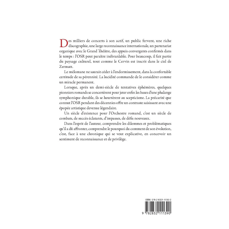 épopée artistique devenue légendaire. Un siècle d’existence pour l’Orchestre romand, c’est un siècle de combats, de succès éclatants, d’impasses, de défis nouveaux. Dans l’esprit de l’auteur, comprendre les dilemmes et problématiques qu’il a dû affronter, comprendre le pourquoi du comment de son évolution, c’est, face à une chronique qui se veut explicative, en concevoir un
