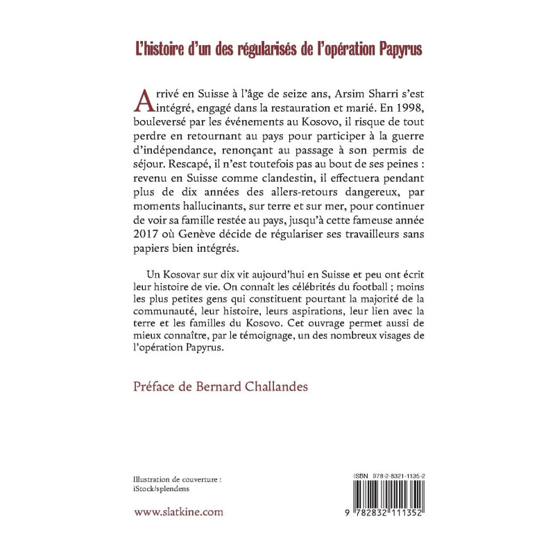 Arrivé en Suisse à l’âge de seize ans, Arsim Sharri s’est intégré, engagé dans la restauration et marié. En 1998, bouleversé par les événements au Kosovo, il risque de tout perdre en retournant au pays pour participer à la guerre d’indépendance, renonçant au passage à son permis de séjour. Rescapé, il n’est toutefois pas au bout de ses peines : revenu en Suisse comme clandestin, il effectuera pendant plus de dix années des allers-retours dangereux, par moments hallucinants, sur terre et sur mer, pour continuer de voir sa famille restée au pays, jusqu’à cette fameuse année 2017 où Genève décide de régulariser ses travailleurs sans papiers bien intégrés.