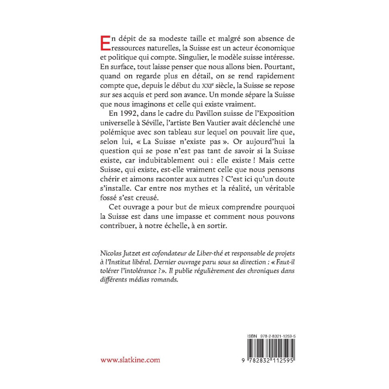 En 1992, dans le cadre du Pavillon suisse de l’Exposition universelle à Séville, l’artiste Ben Vautier avait déclenché une polémique avec son tableau sur lequel on pouvait lire que, selon lui, « La Suisse n’existe pas ». Or aujourd’hui la question qui se pose n’est pas tant de savoir si la Suisse existe, car indubitablement oui : elle existe ! Mais cette Suisse, qui existe, est-elle vraiment celle que nous pensons chérir et aimons raconter aux autres ? C’est ici qu’un doute s’installe. Car entre nos mythes et la réalité, un véritable fossé s’est creusé.
